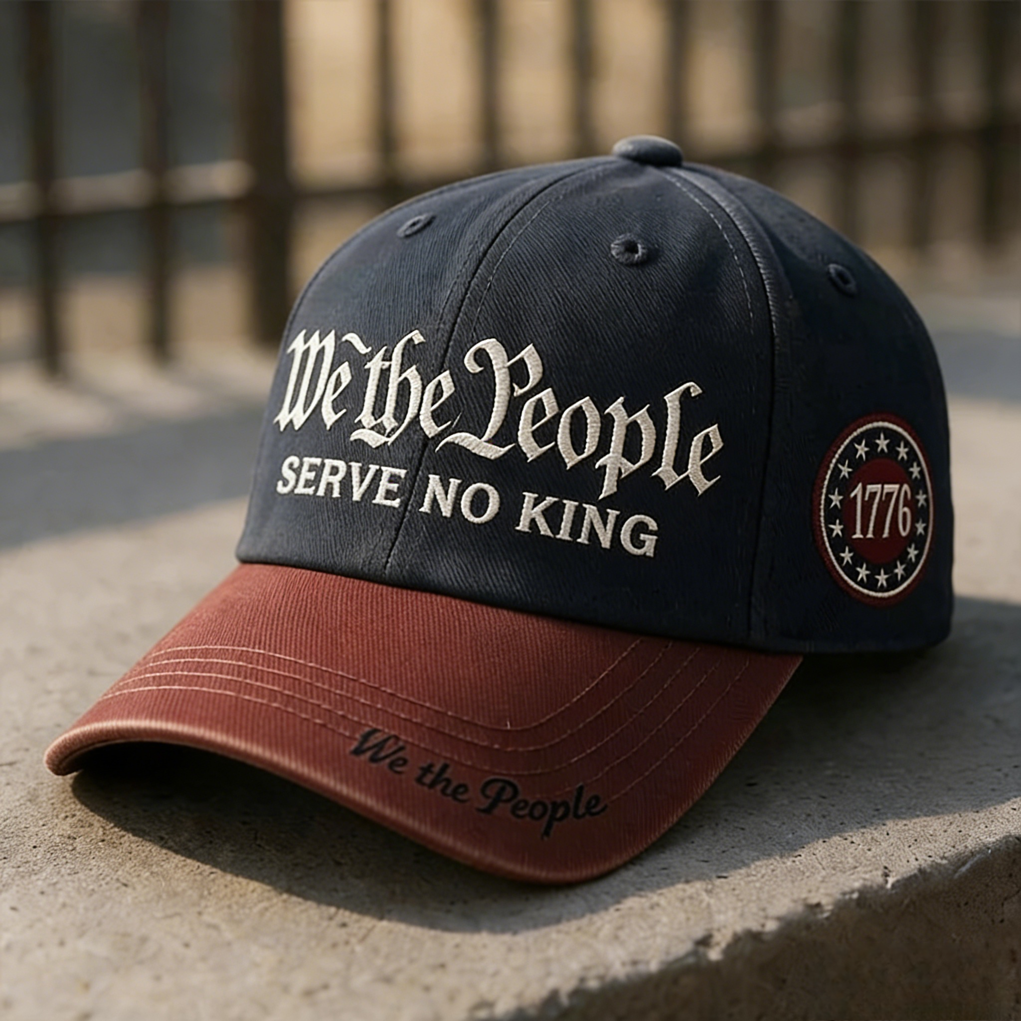 Inspired by the founding spirit of America, this vintage baseball cap proudly features the iconic phrase “We The People SERVE NO KING”, paired with a classic 1776 emblem. More than just a hat, it’s a bold expression of values, history, and timeless style.